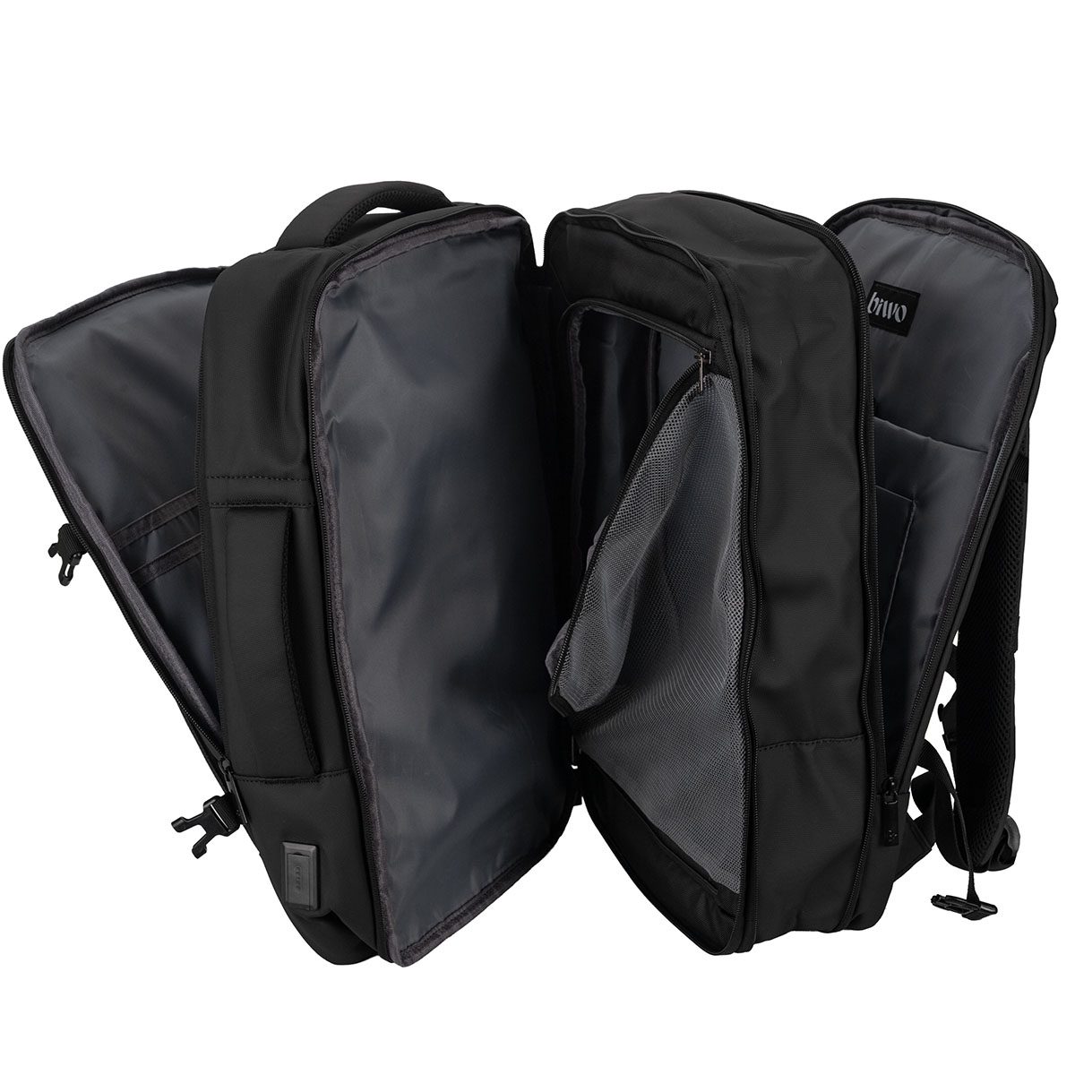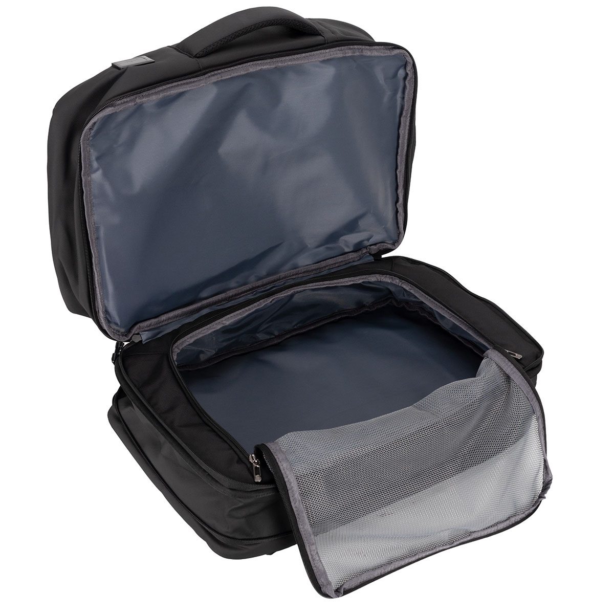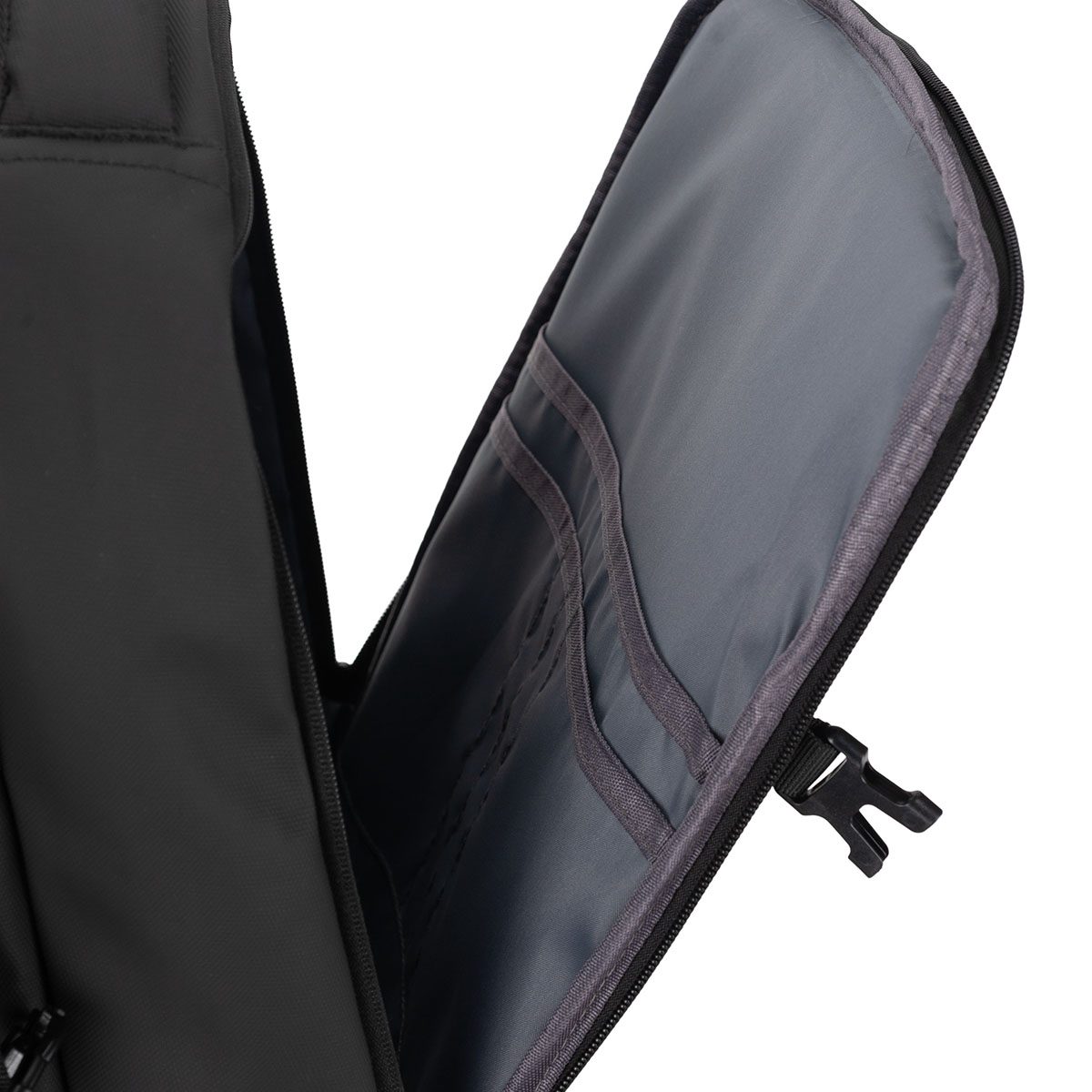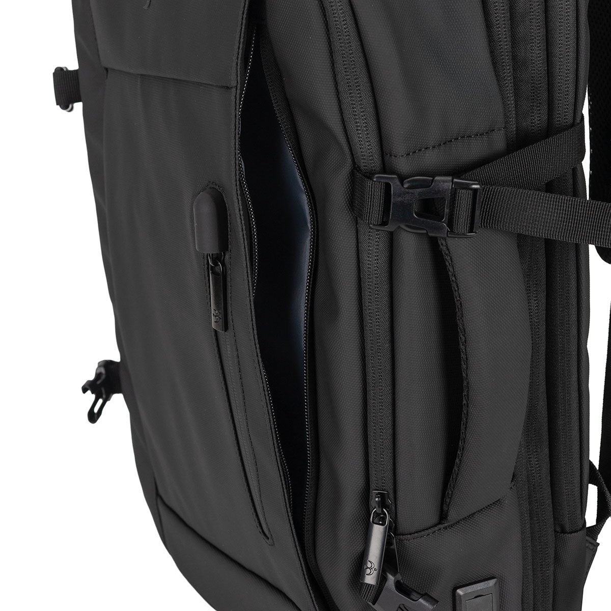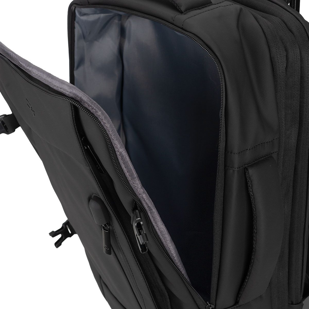 3 Compartimentos principales. Tiras de compresión. Uno con porta notebook más tablet acolchado y cierre elástico. 2 do con Organizador interno de malla para empaque. 3ro con Organizador Bolsillo interno. Alta capacidad. Asa superior. Dos Bolsillos frontales con cierre. Bolsillo de seguridad trasero. Espalda Dry fy. Conector puerto USB más A+C. Faja para asegurar a equipaje. Tiras de hombro ajustables. Tira de pecho.