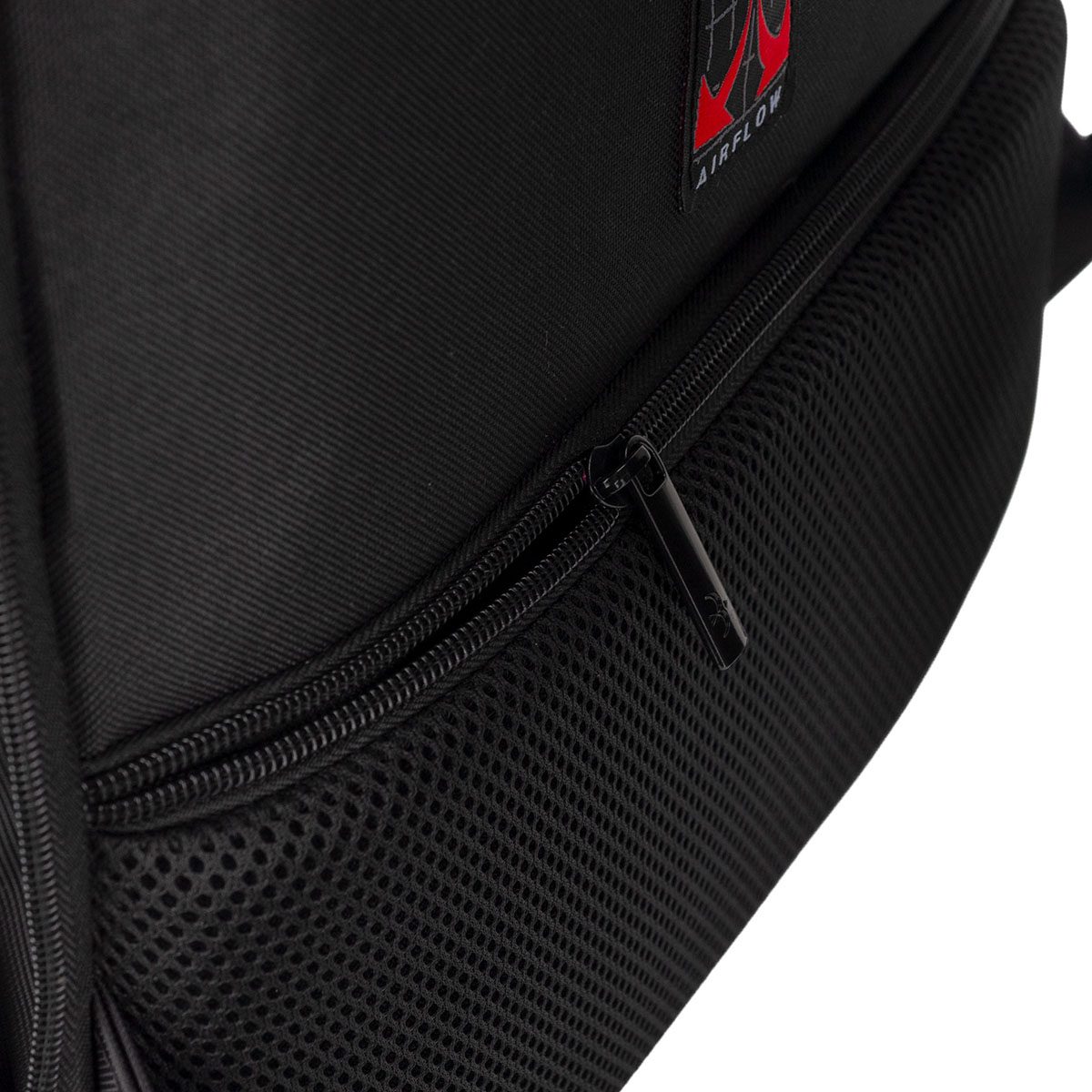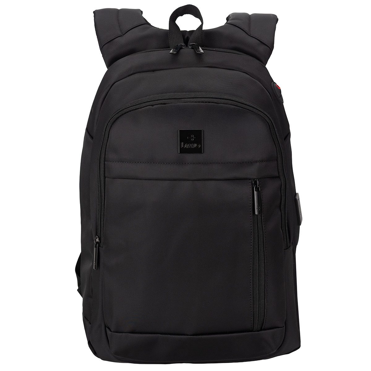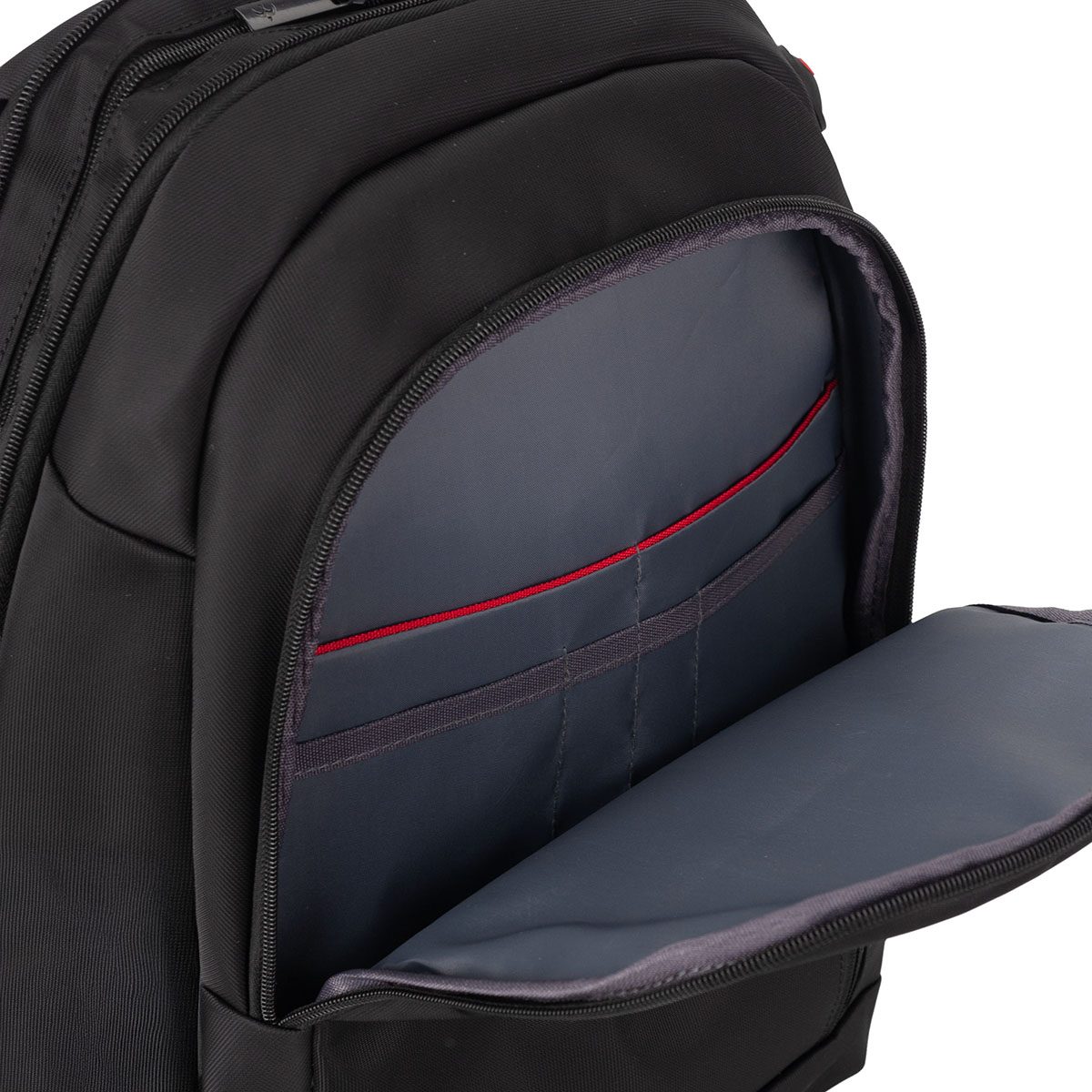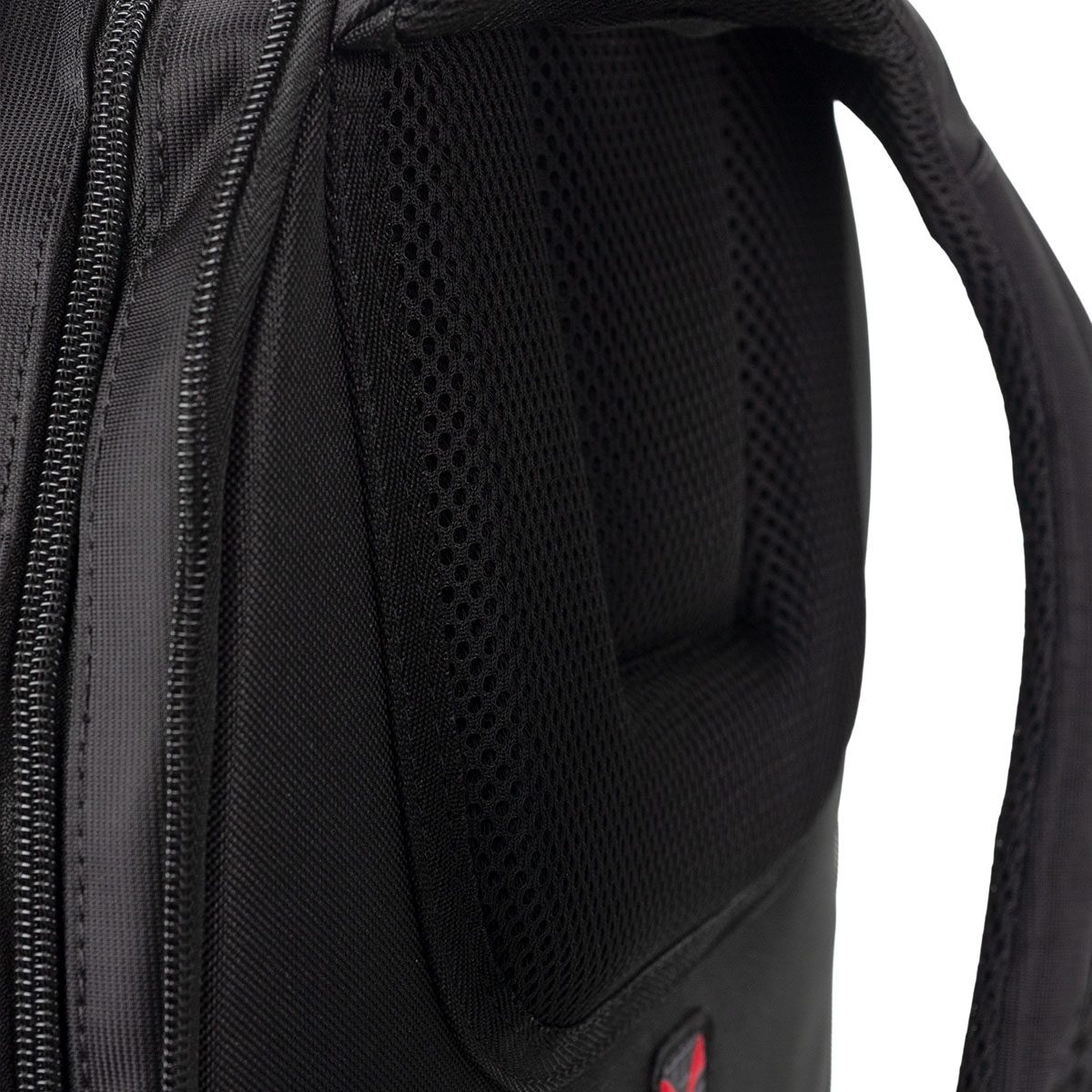 Interior con organizador. Bolsillos frontales. Bolsillos laterales elastizados de tela de malla. Porta notebook acolchado alto impacto con traba. Costuras reforzadas. Cierres metálicos. Correa de hombro ergonómica con hombrera acolchada, forrada con tela antitranspirante. USB para cargador.