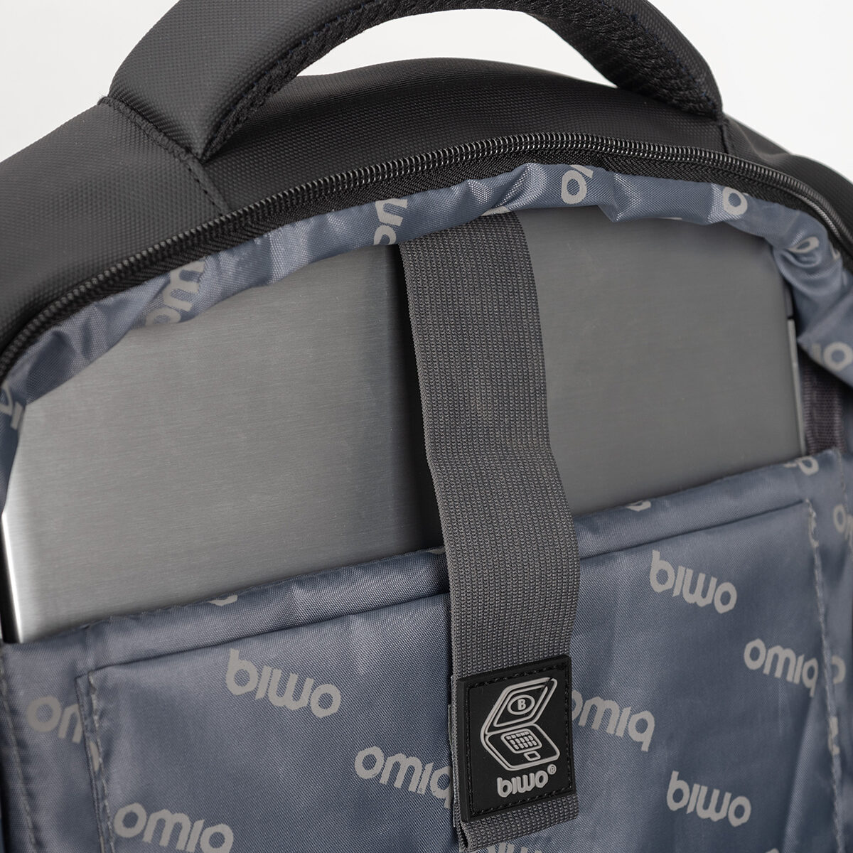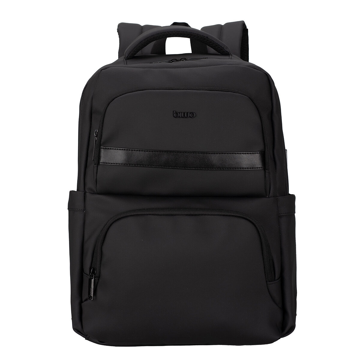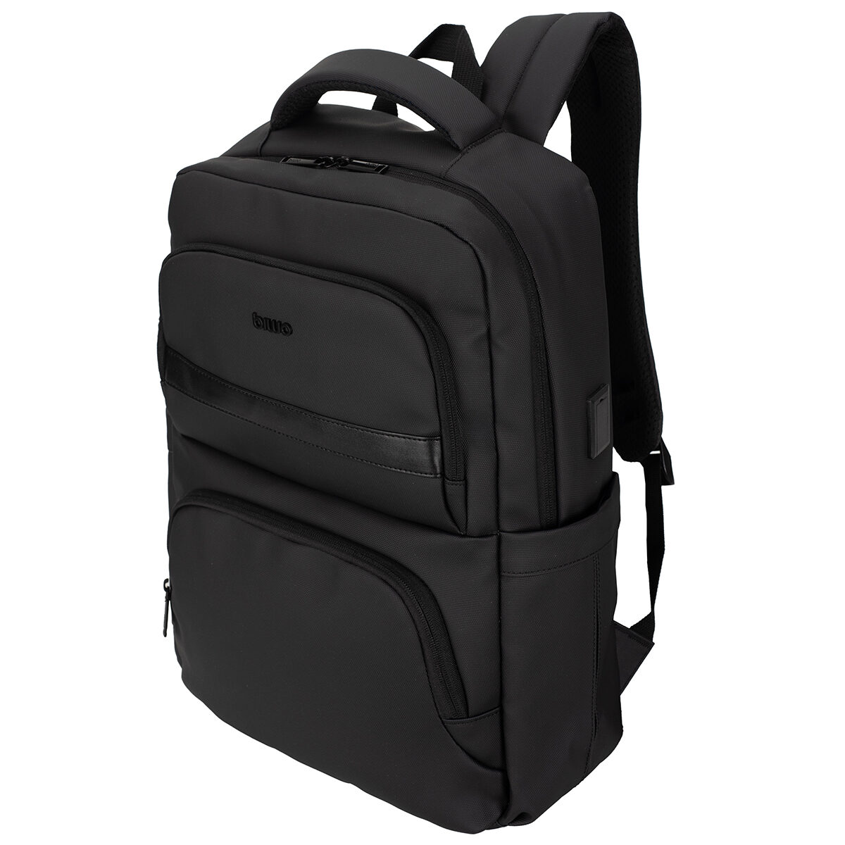 Compartimento principal con cierre. Doble bolsillo frontal con cierre. Bolsillo lateral porta botella. Compartimento para portátil de 15,6” y/o tablet. Asa de mano superior. Espalda acolchada con Dri Fit. Faja para ajustar a maleta.