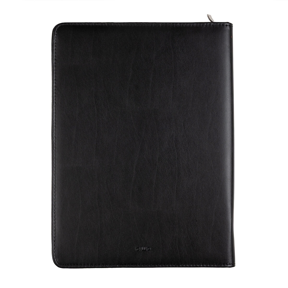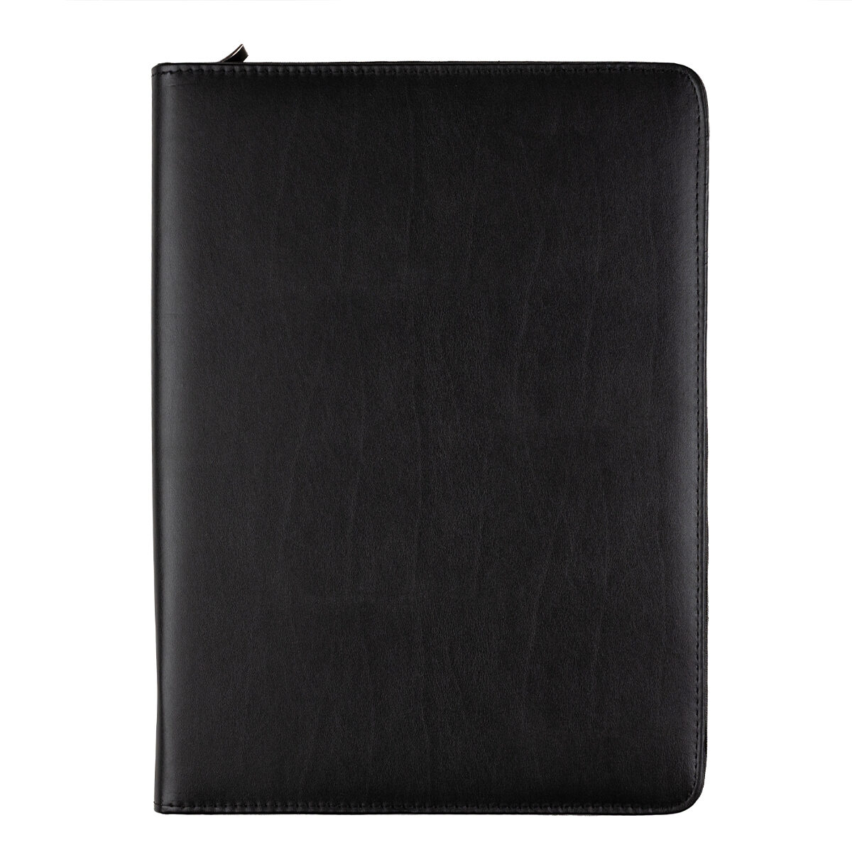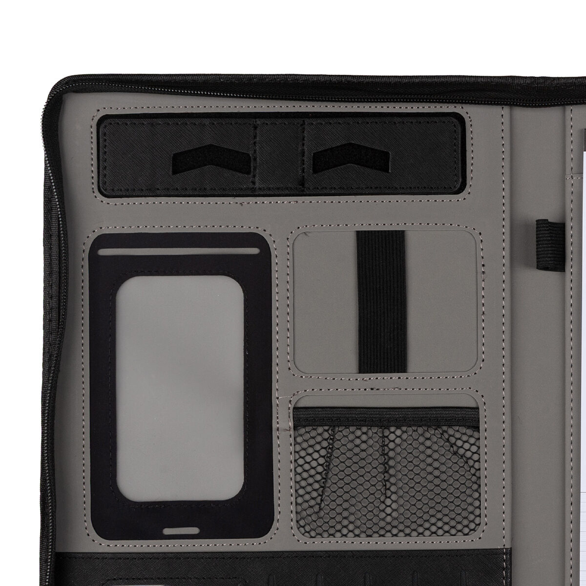 Portfolio cierre perimetral, bolsillo de maya, block de hojas milimetradas, porta bolígrafo, bolsillo con cierre, porta tarjetas. Porta tablet -celular, sujetadores elásticos